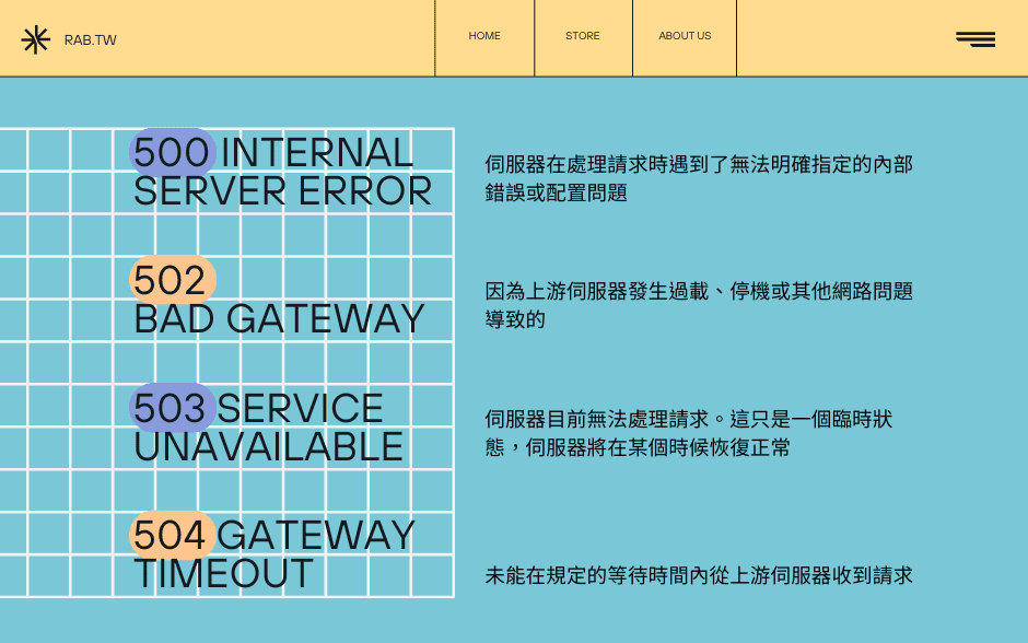 - 503 Service Unavailable:由於臨時的伺服器維護或過載,伺服器目前無法處理請求。這通常只是暫時狀態。
