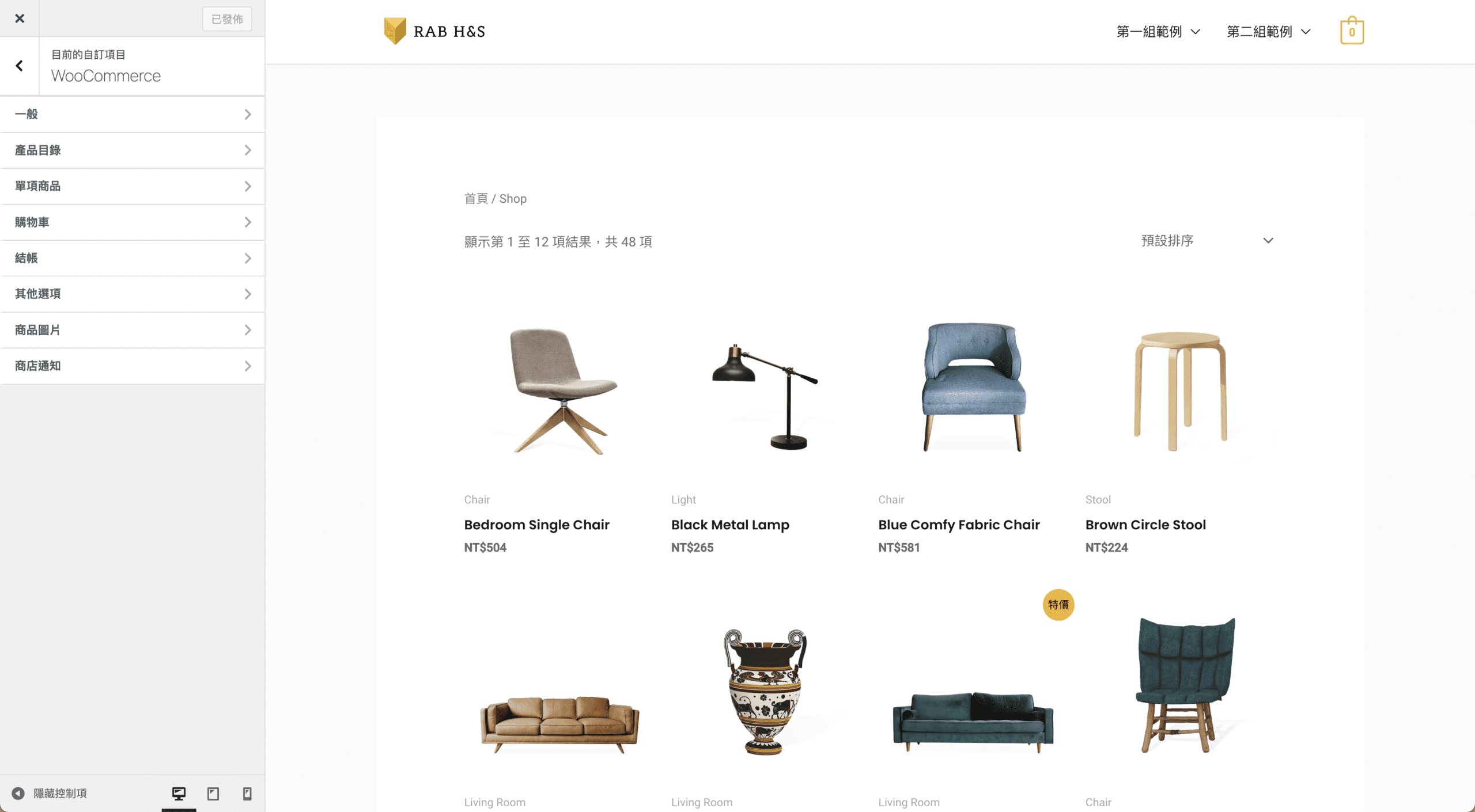 - 產品目錄:調整商品列表頁排版,是否顯示分類、篩選器、商品資訊、加入購物車按鈕等等。