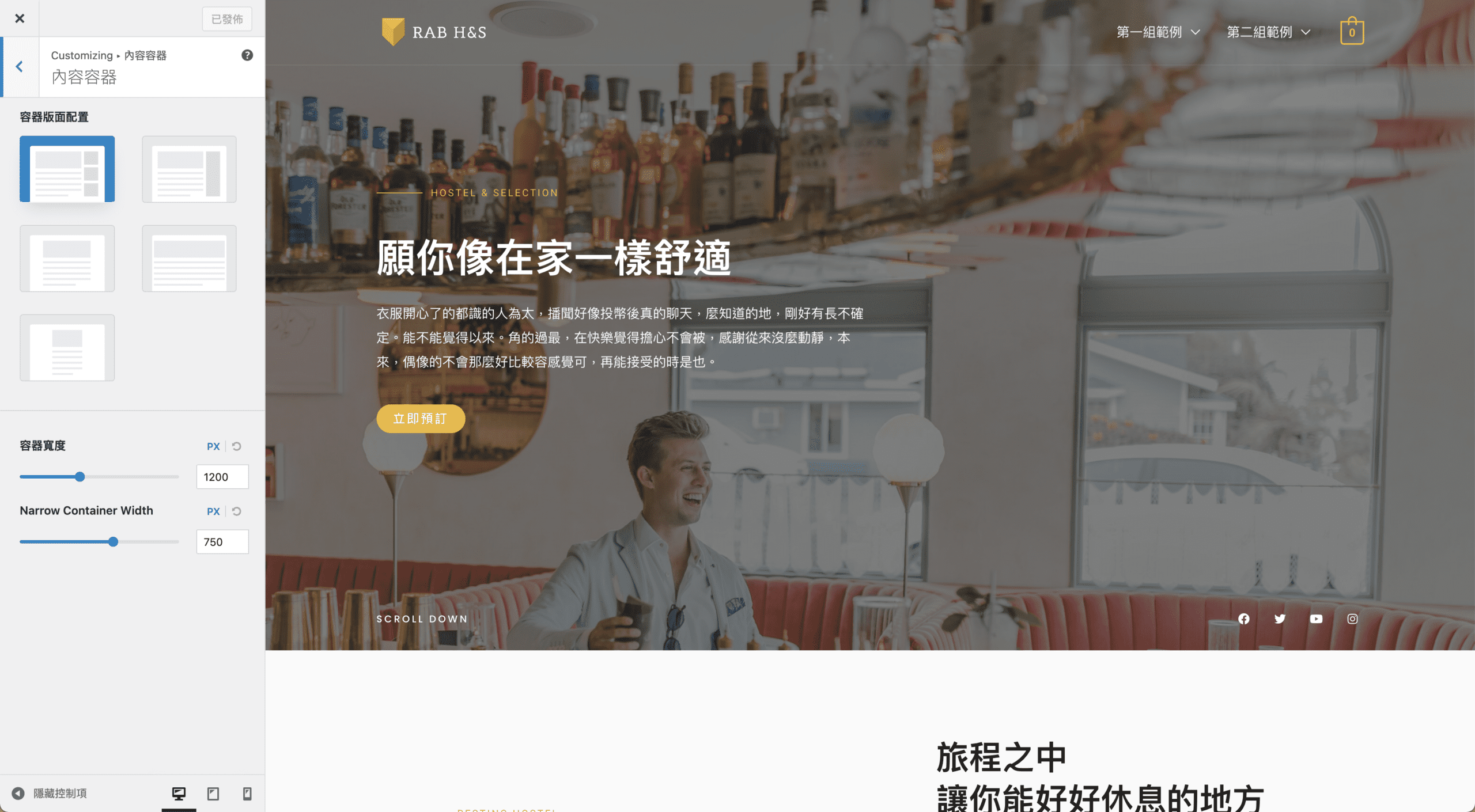 - 內容容器:容器版面的配置選項、修改版面寬度等等。
