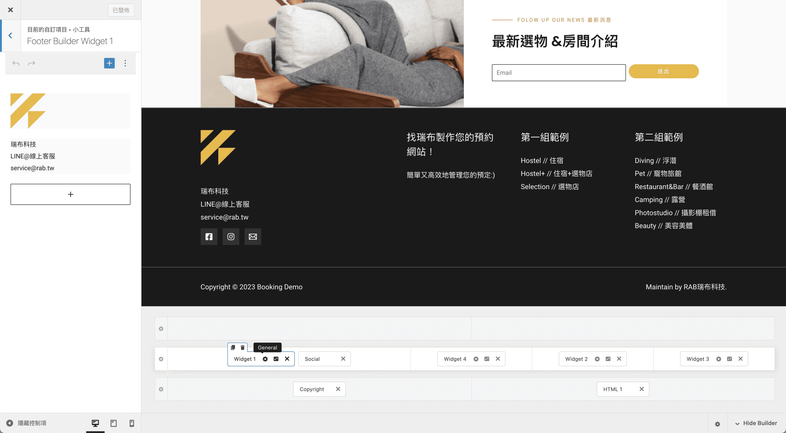 修改頁尾。頁尾是利用小工具、選單組成,點進各個區塊就可以各別調整。也可以到 外觀->小工具、外觀->選單 調整。