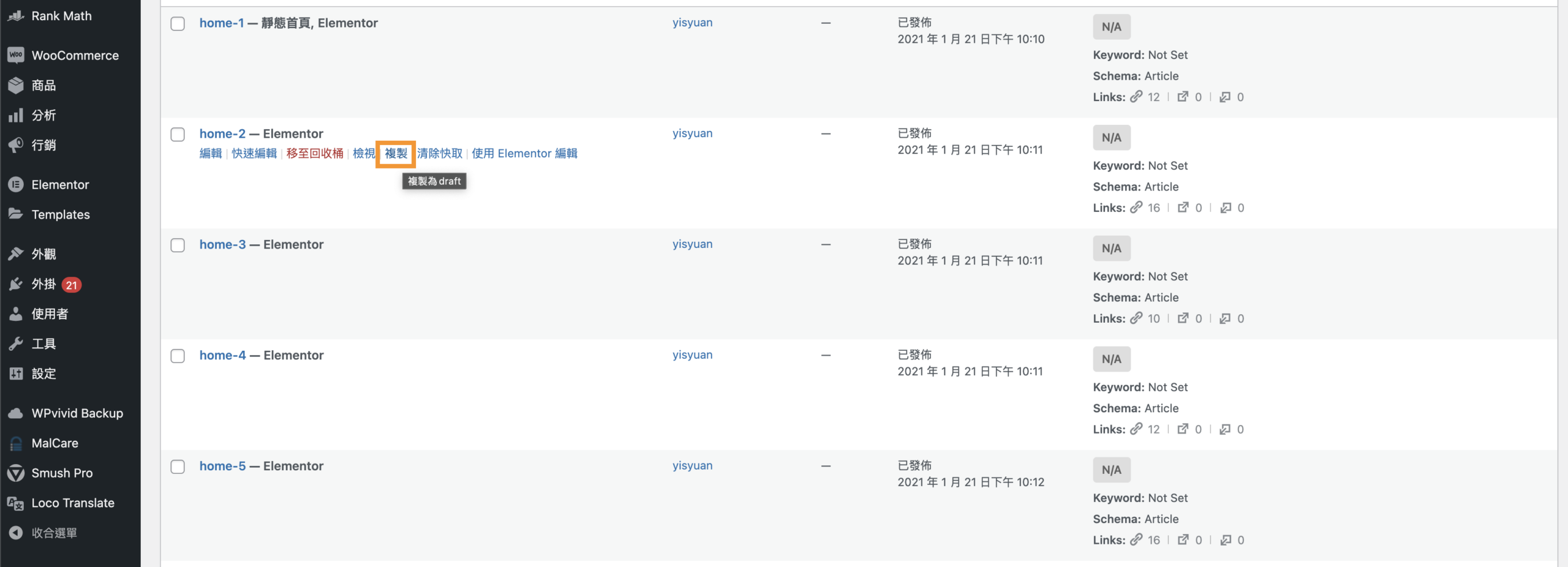 只要在後台頁面或文章列表的地方,將滑鼠移到你想複製的頁面或文章上面,點擊複製,就完成複製了,新複製好的頁面或文章,預設會是草稿,之後再編輯修改草稿內容,完成後發表,新的一頁就可以迅速地上架了!是不是非常方便又省時省力呢!