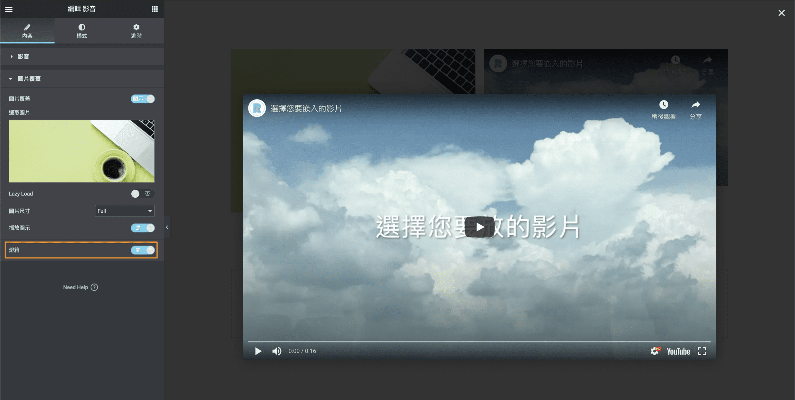 若開啟燈箱選項的話,點選影片時會自動跳出燈箱播放影片。若無則會在原處播放。