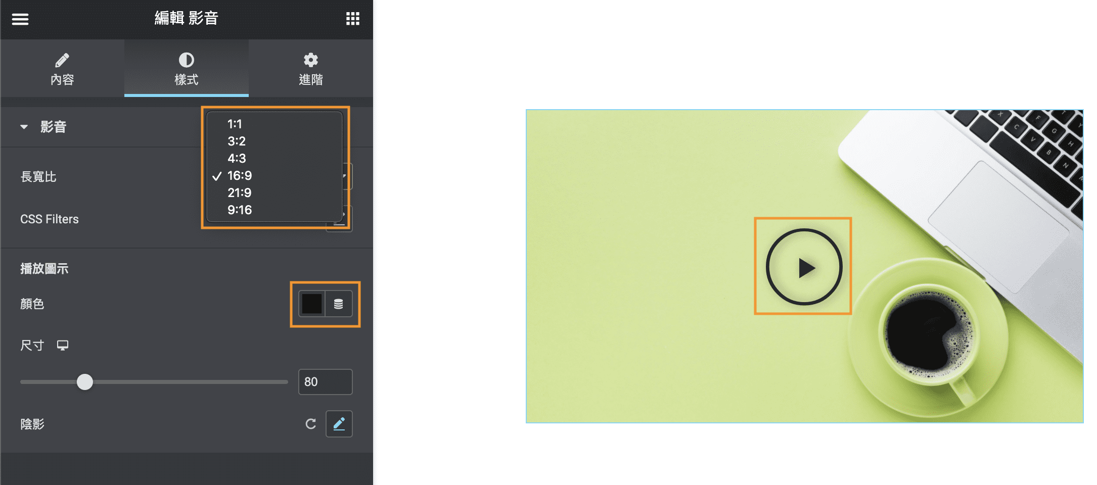 在樣式的地方可以調整影片顯示的長寬比、播放圖示的顏色、尺寸、陰影等等。