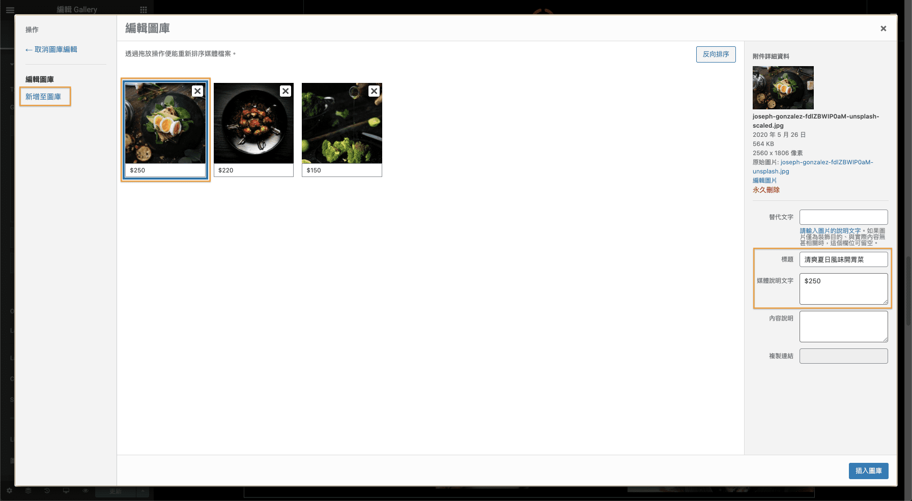 可以新增或刪除此分類的圖片,也可以編輯圖片的標題及說明文字。
