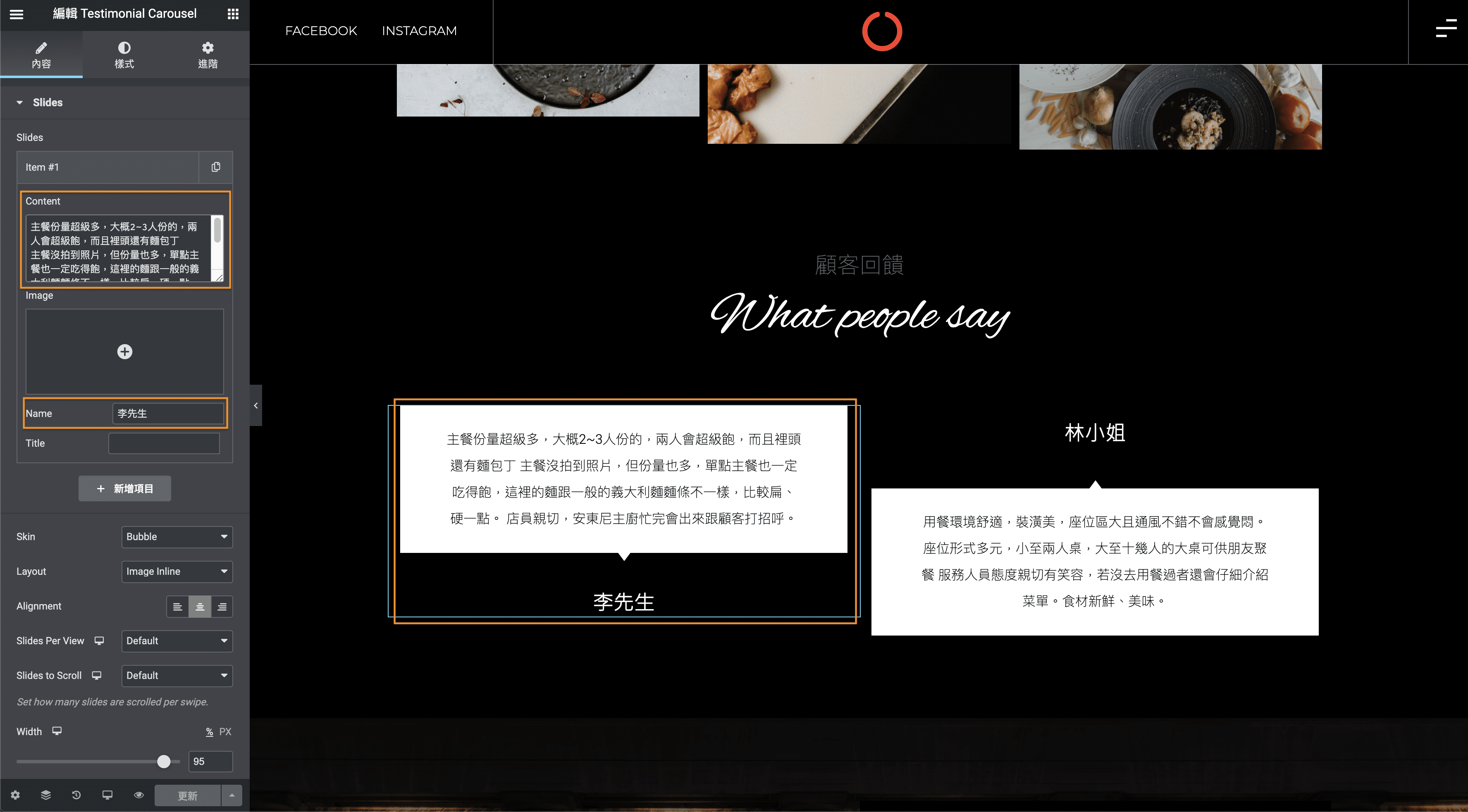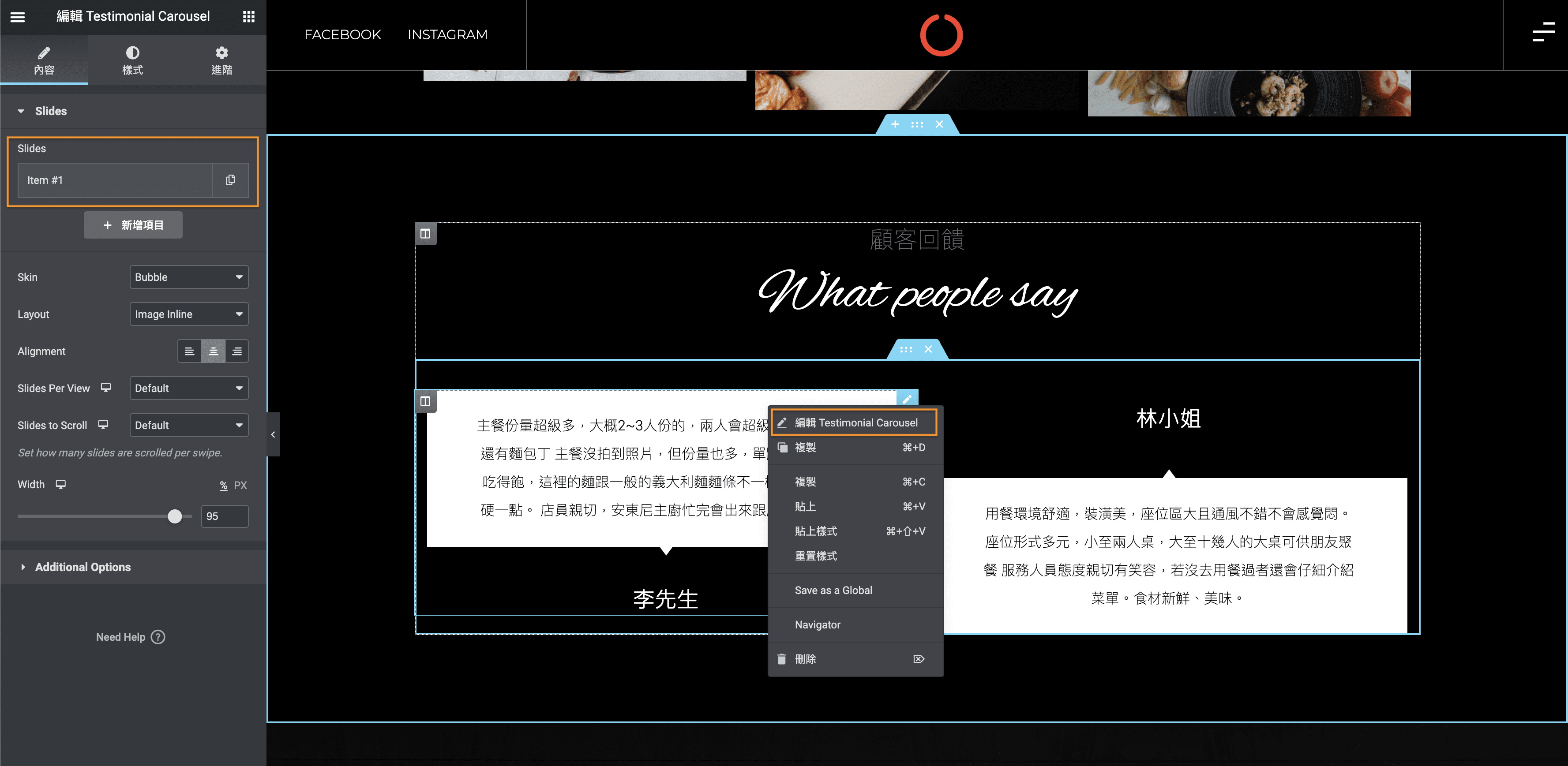 在此demo設計中,只有兩個評論,且不會有輪播動畫。欲編輯該項目,同樣地在它上面點選右鍵,編輯 Testimonial Carousel,或直接按左鍵。
