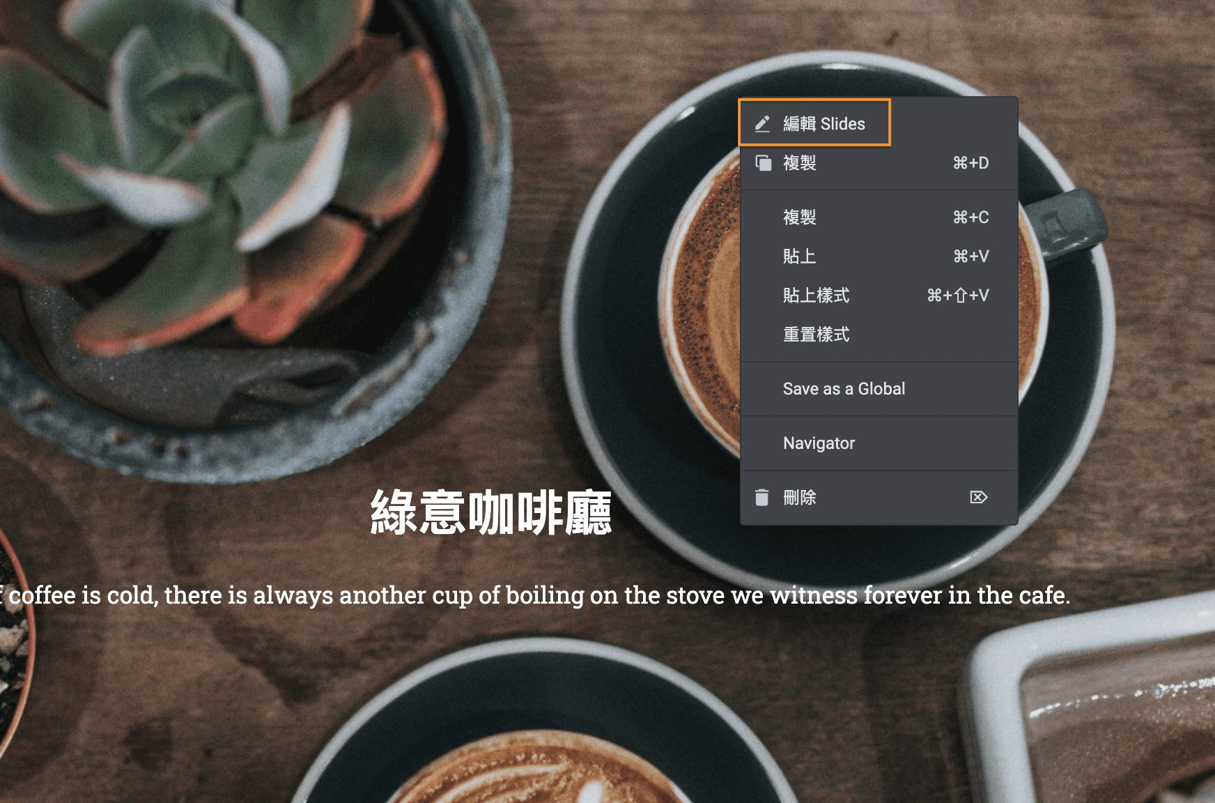 如何編輯輪播中的圖文呢?我們進到使用Elementor編輯的後台後,在圖上點按右鍵。