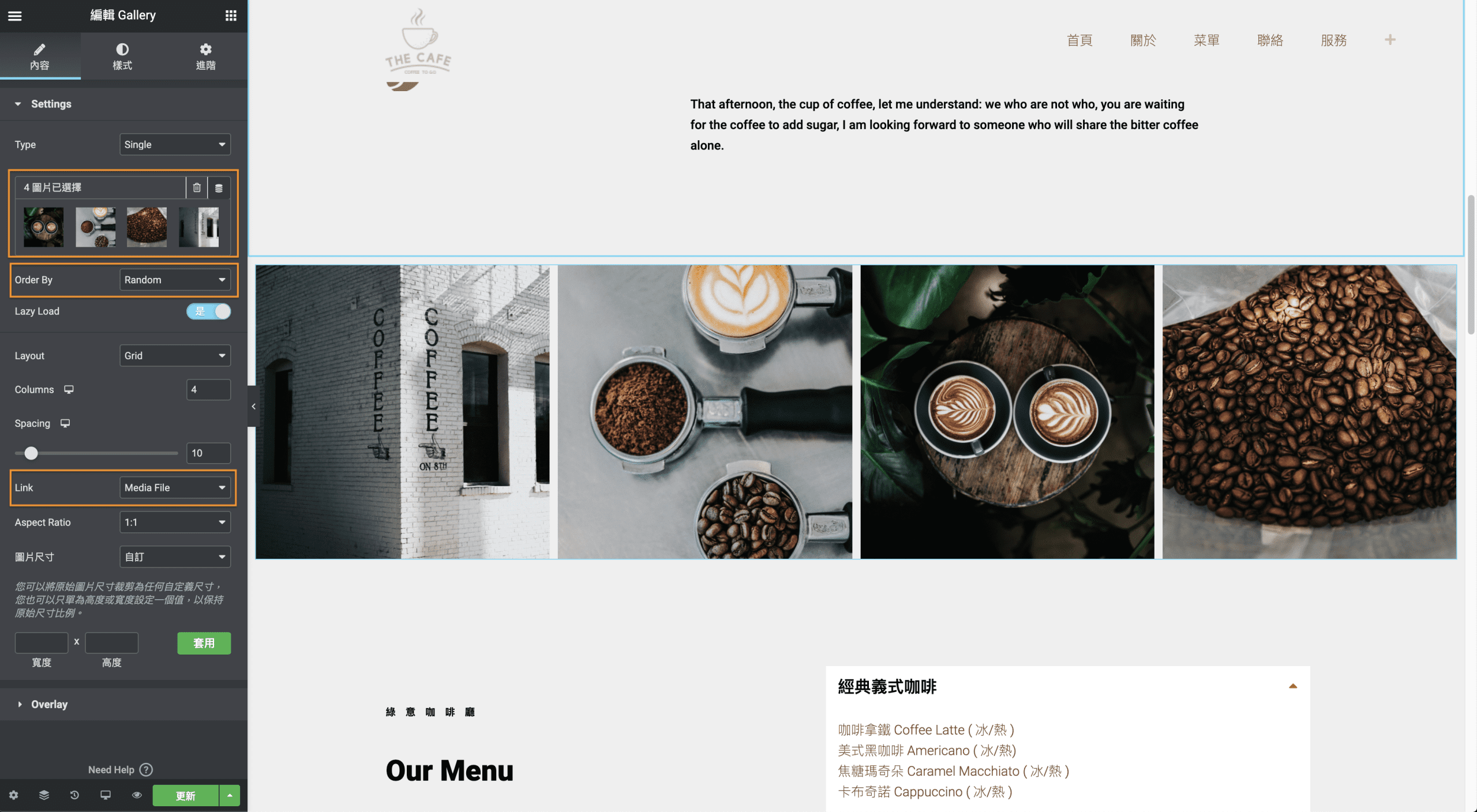 點按圖片區可以更改圖片,Order by 則是圖片排列的順序,現在是選擇 Random(隨機排列),每次重新整理後圖片的排列順序都不同。也可以選擇 Default(預設值),就會依照後台的圖片順序做排列。Link 的部分則是點選圖片後會呈現什麼,現在是 Media File(媒體檔案),點選圖片後會出現該圖的畫面,另外有 None、Custom URL(連結) 可以選擇。