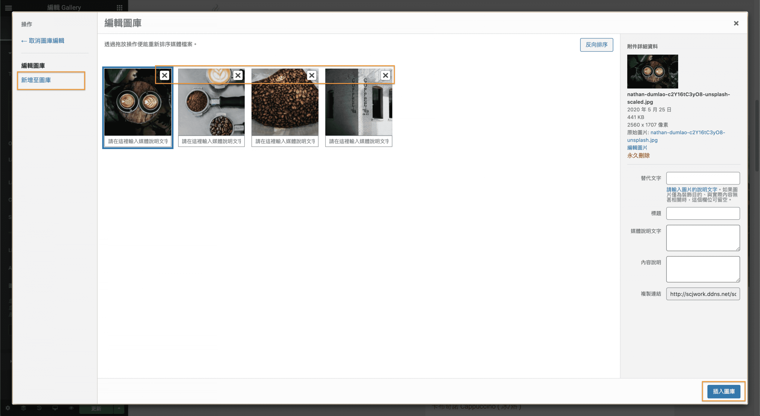 可以先把原來的圖片刪除(按叉叉按鈕),再點選新增至圖庫,可以上傳新的圖片或是選擇媒體庫原有的圖片,選擇四張圖片後在右下角點選新增至圖庫,會回到這個畫面,再按右下角的插入圖庫就大功告成!而這裡的圖片順序就是預設值會出現的圖片順序,若要變換順序,可以將圖片前後拖曳更換位置。