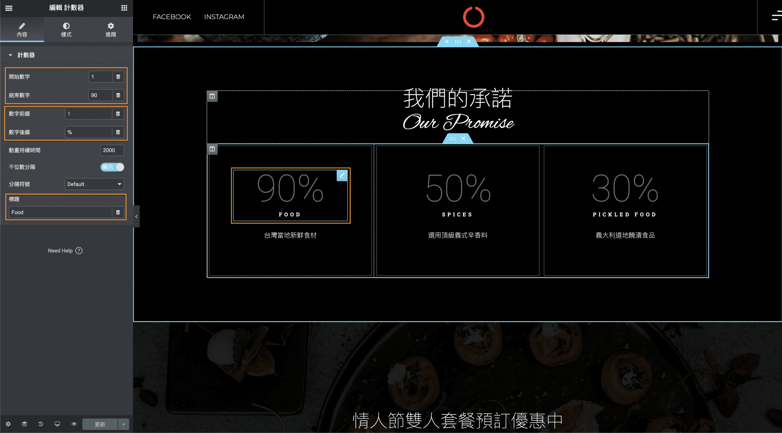 左偏區域可以編輯數字及數字後欲呈現的符號,這裡是? %,開始數字1,動畫會從數字1開始跑到結束數字90。計數器的標題也可以更改。而計數器下方的台灣當地新鮮食材,可以直接點選修改。
