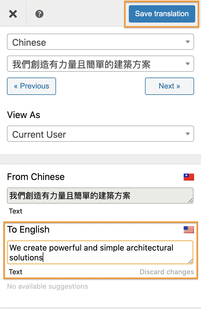 左邊就會變成該段文字的編輯區,即可更改英文翻譯的部分,每更改完一次就必須儲存,可以按上方的 Save Translation 按鈕儲存,也可以按鍵盤快捷鍵 CTRL+S(蘋果電腦為 Command+S)儲存。