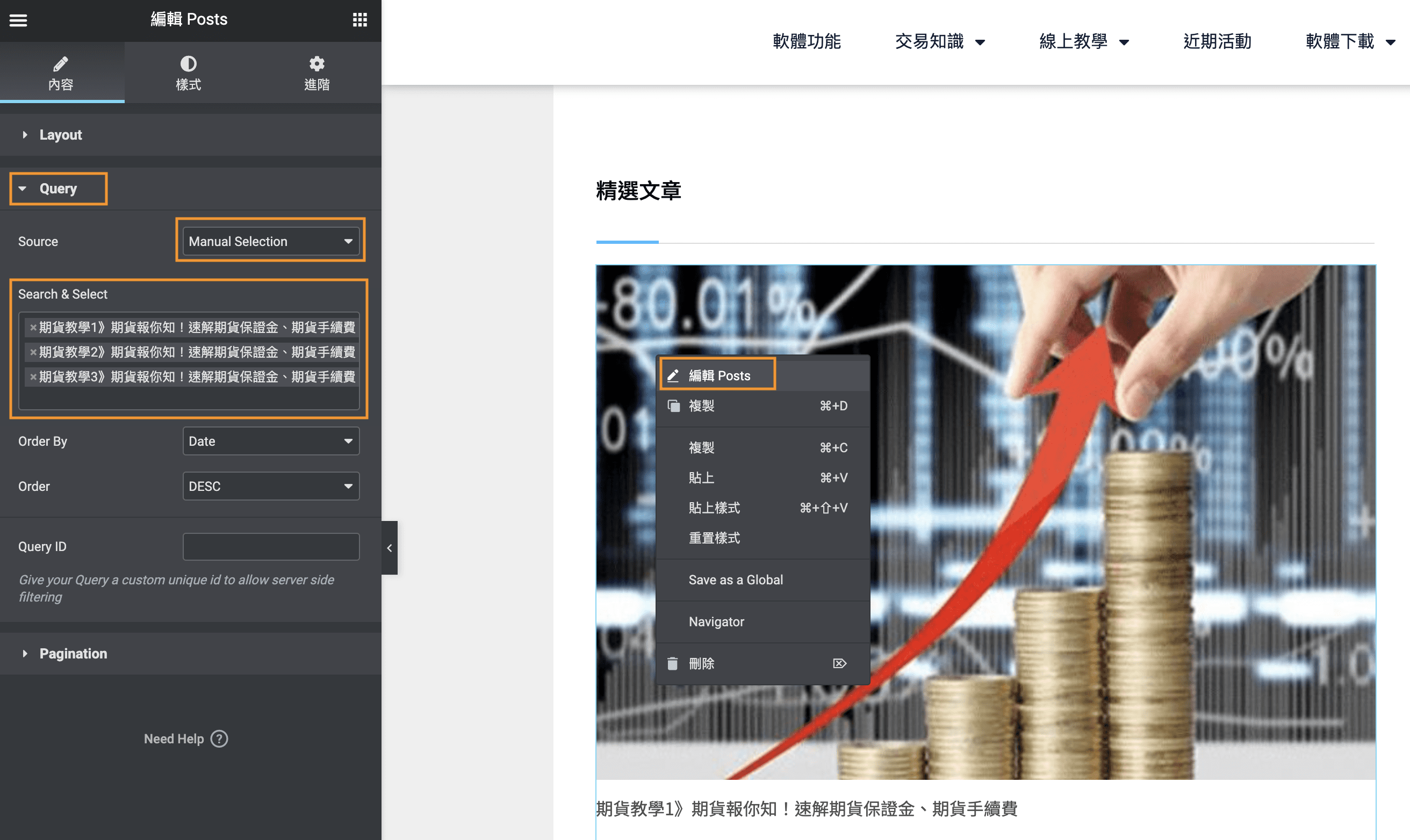 使用 Elementor 指定精選文章