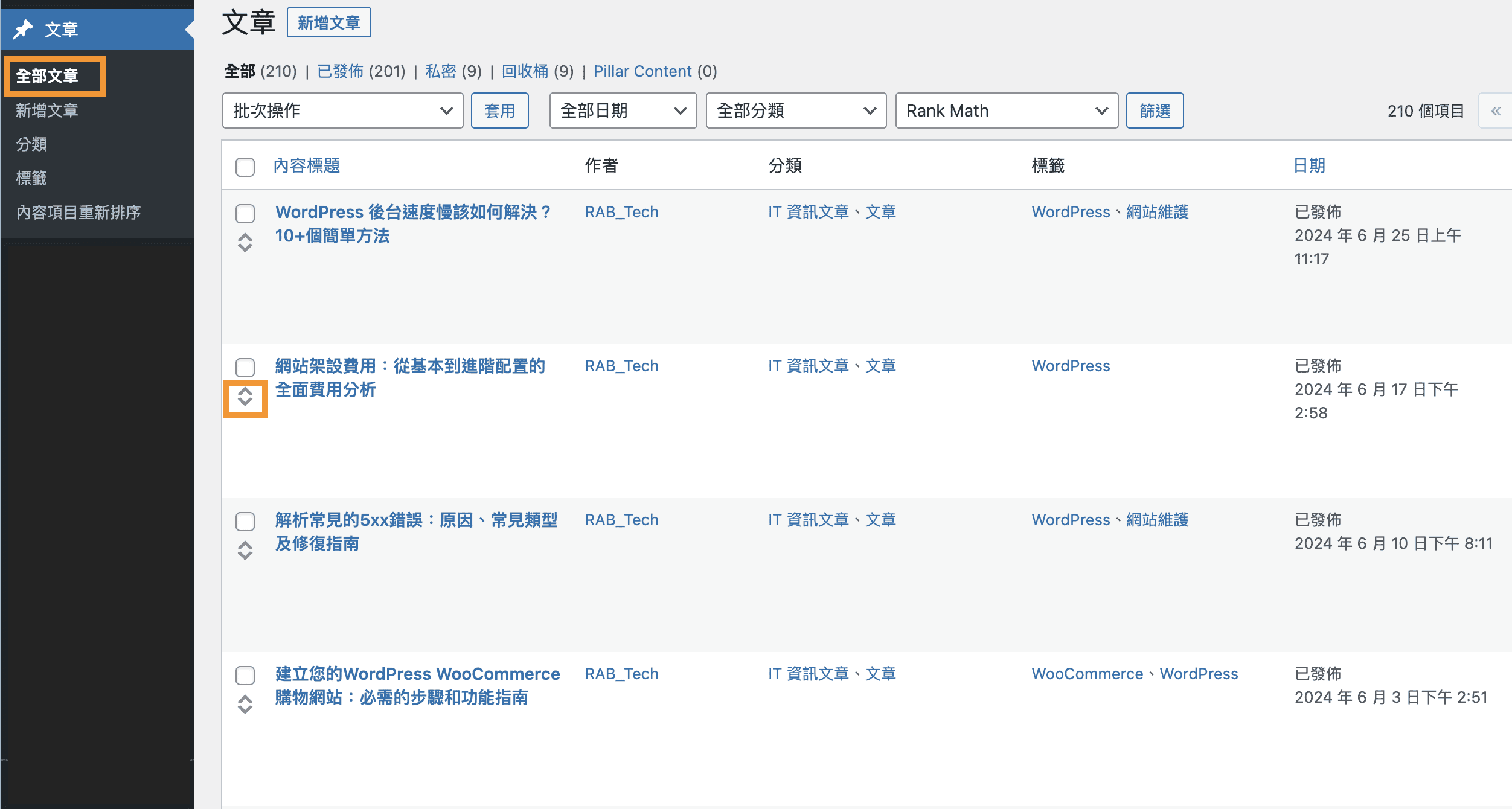 也可以在全部文章的地方直接拖移、排序。