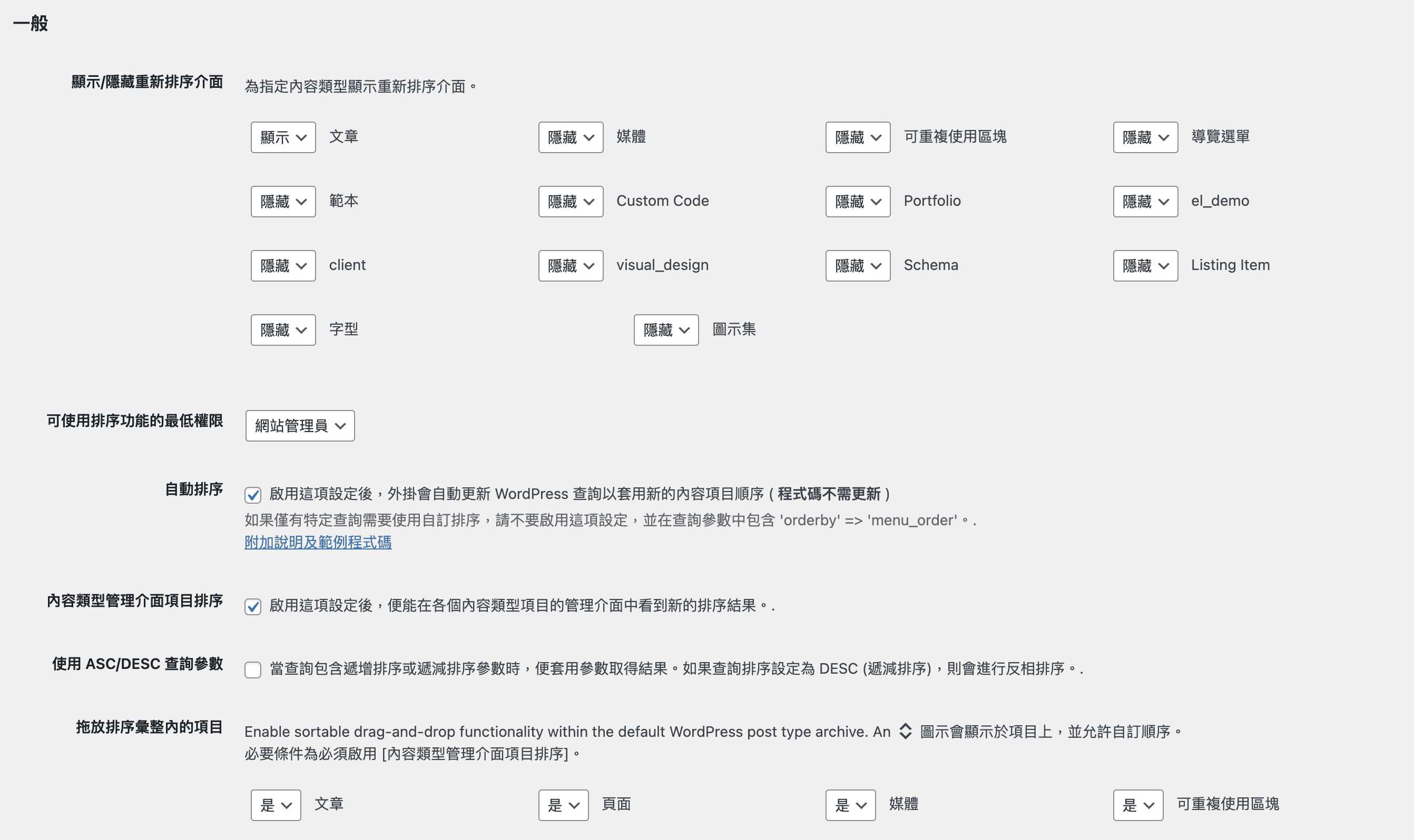啟用外掛後先進行一般設定,設定 –> Post Types Order