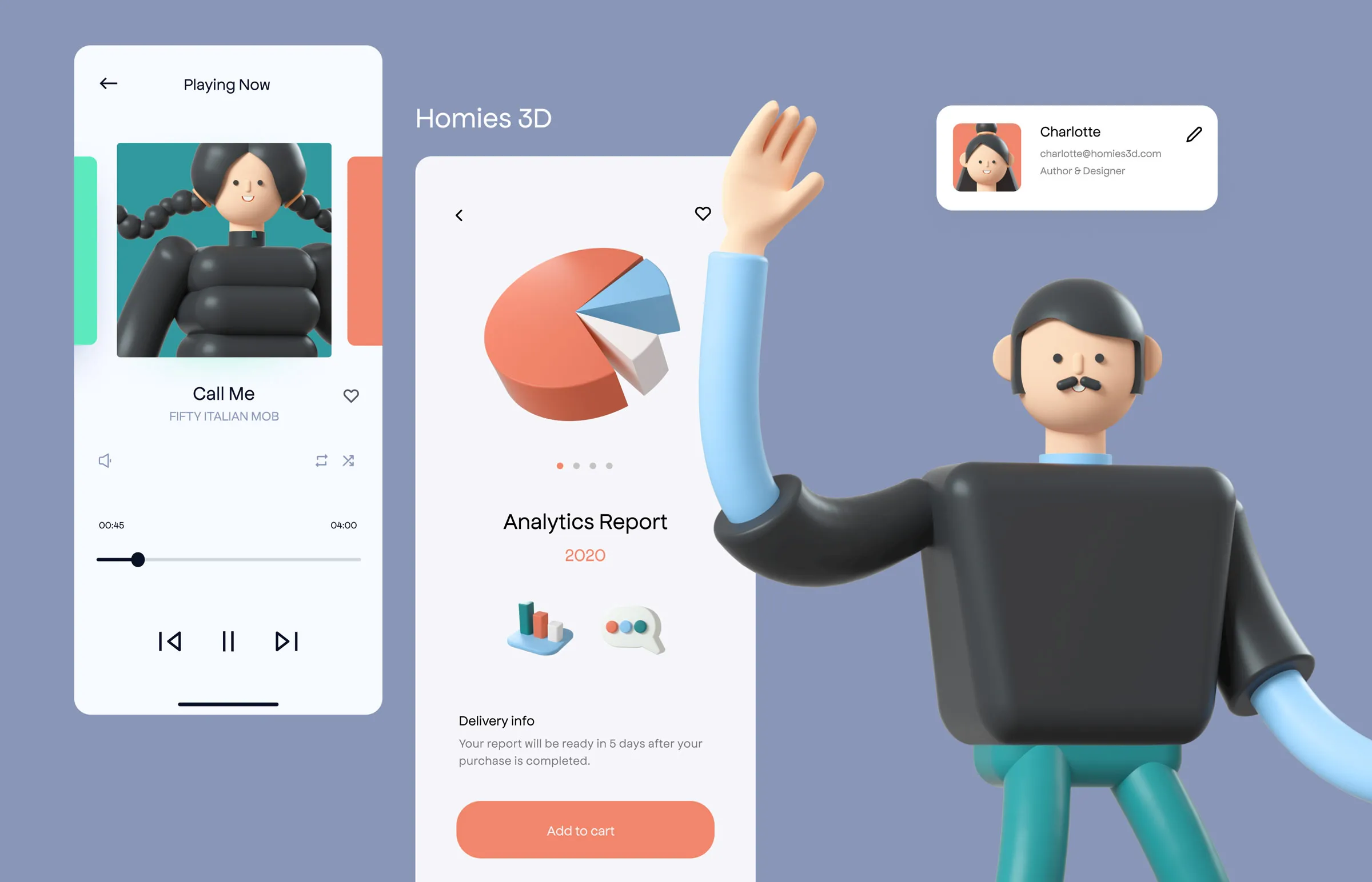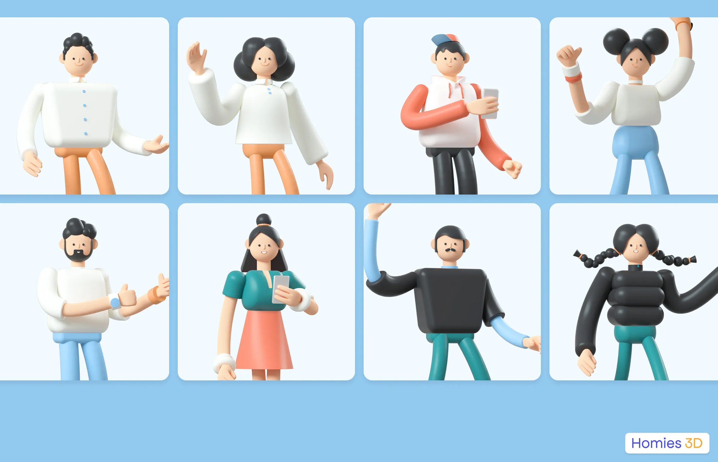 Homies 3D 為您的項目提供夢幻般的 3D 世界。它包含優質的字符和圖標!他們精心策劃了自己的系列,同時牢記設計師的需求。它可以透過有吸引力的 3D 元素和可自訂的顏色幫助您將設計項目提升到一個新的水平。