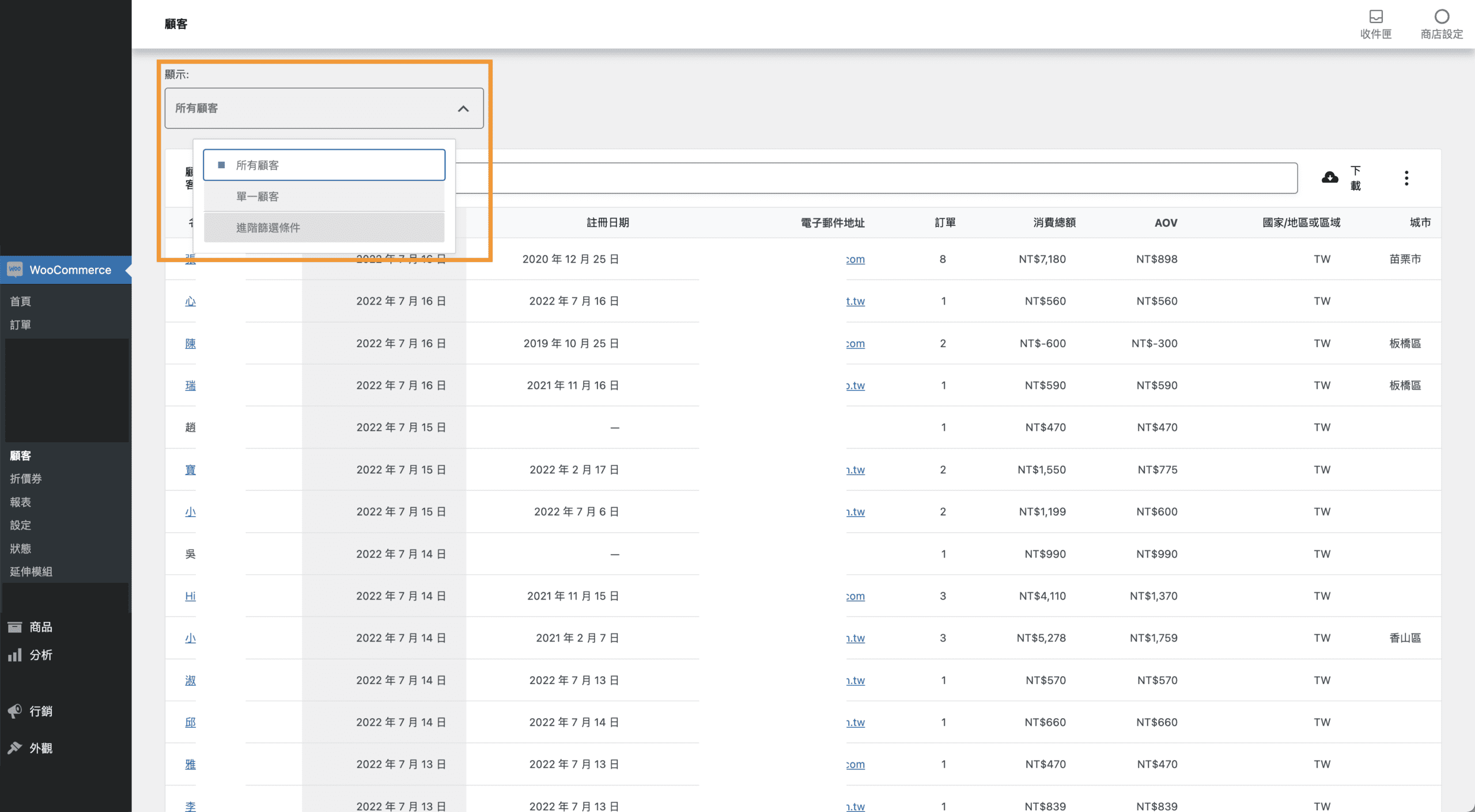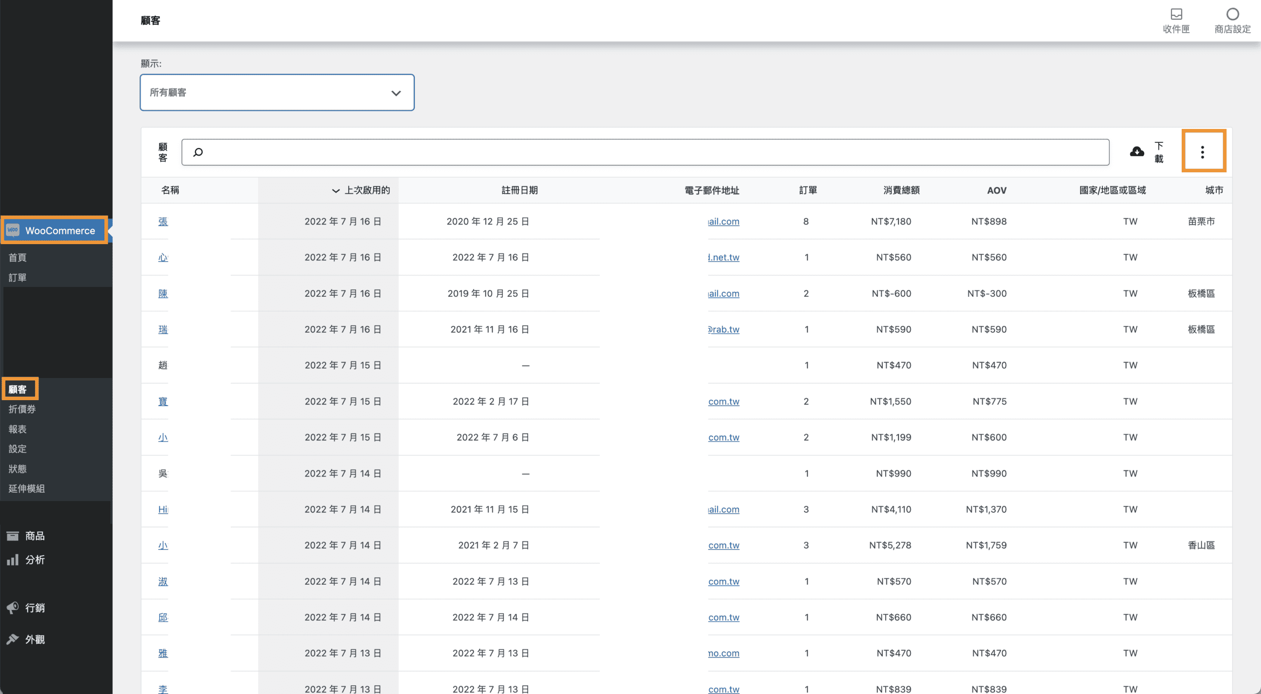 WooCommerce有提供顧客資料匯出的功能,方便店家管理客戶資料,點選 雲端圖示下載,會將資料寄到您的使用者信箱。