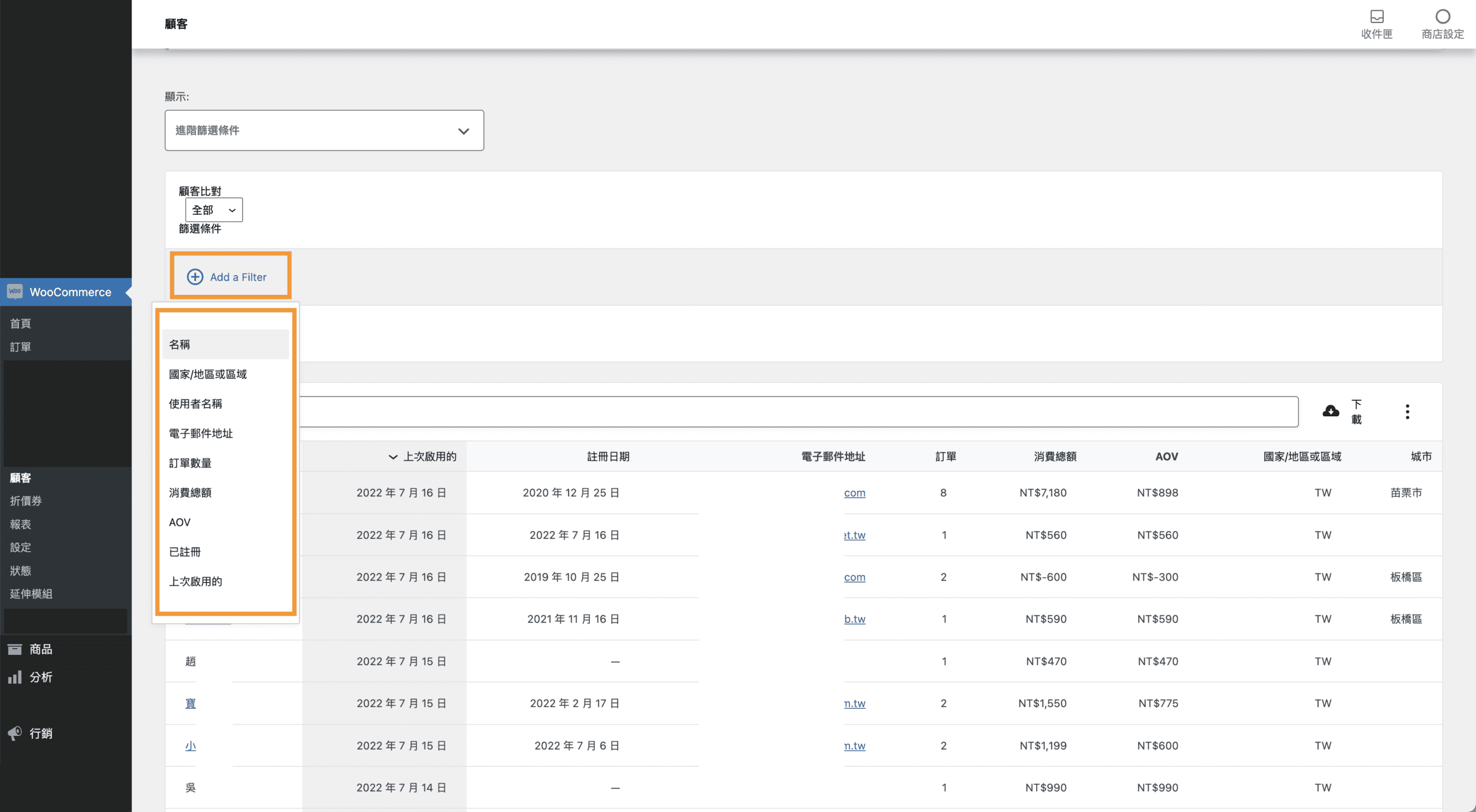 點選 Add a Filter,可以選擇要篩選什麼顧客內容。