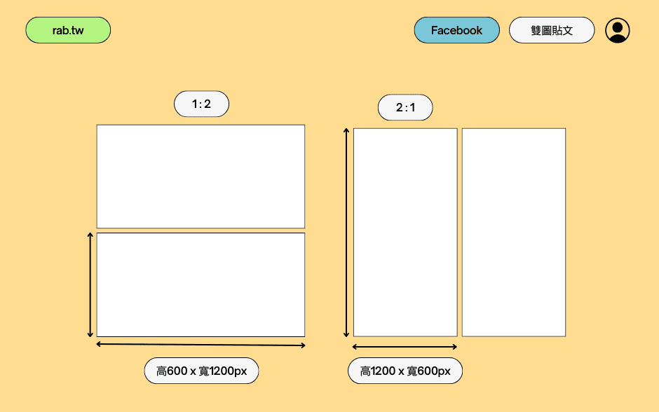 - 橫式雙圖的尺寸為 1200 x 600 像素(px)。
