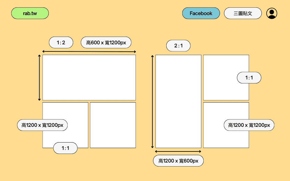 - 橫式三圖,第一張圖片尺寸為 1200 x 600 像素(px),而第二和第三張圖片(由左至右)的尺寸均為 1200 x 1200 像素。
