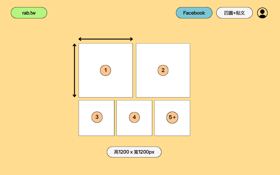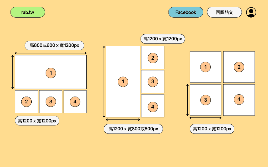 - 橫式四圖,第一張圖片尺寸為 1200 x 800或600 像素(px),而第二至第四張圖片的尺寸均為 1200 x 1200 像素(px)。