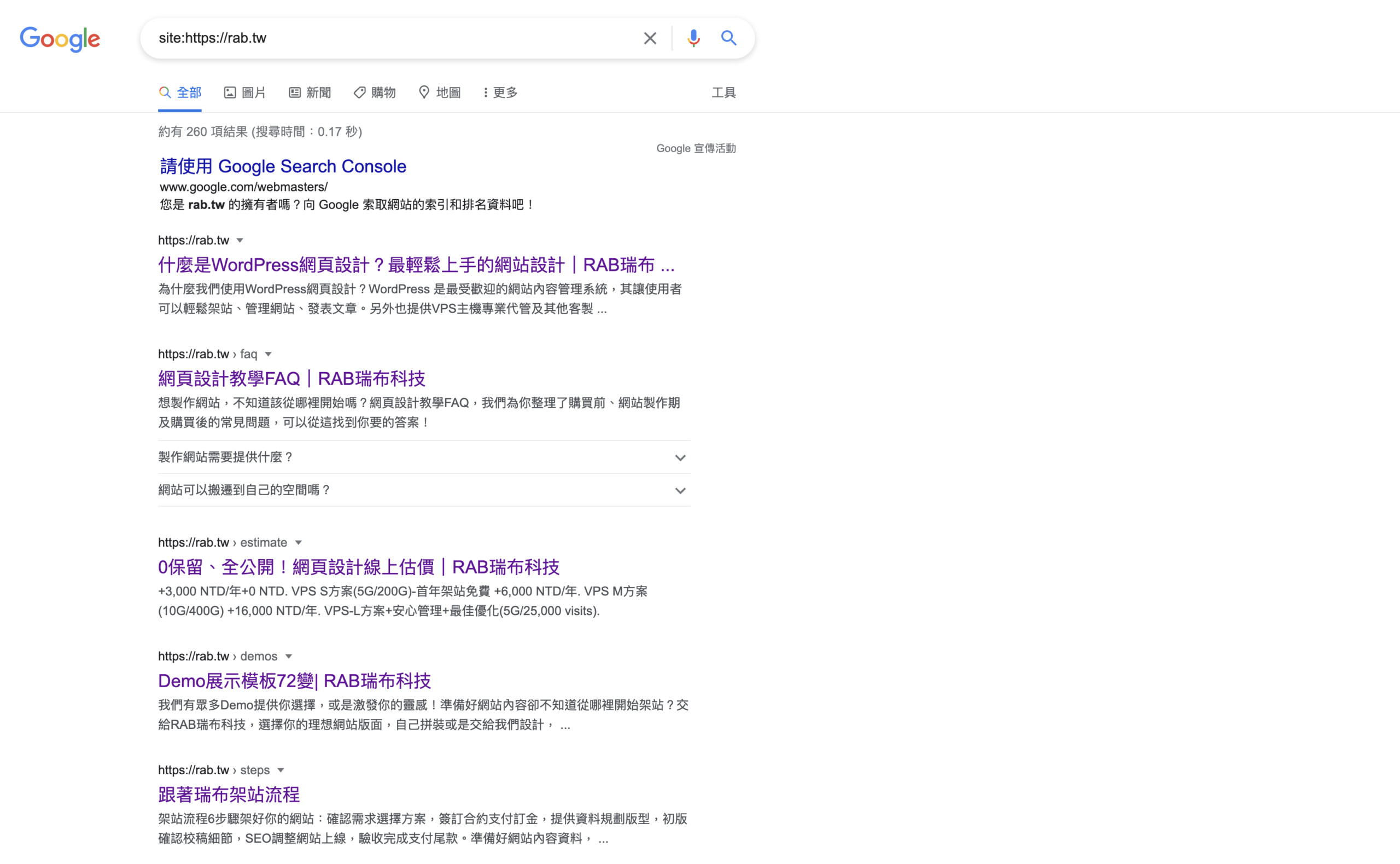 如果自己的網頁有顯示在搜尋結果中,那就表示 Google 已經成功爬文並收錄在它的搜尋引擎資料庫當中了。