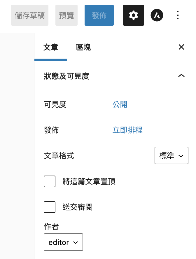 作者的部分預設為目前登入的使用者,可以選擇其他使用者為作者,若文章前台會顯示作者,這邊記得選取唷!