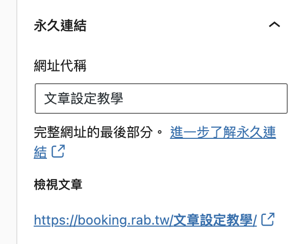 文章的永久連結,文章儲存為草稿後可以編輯,建議可以修改為英文網址,若是中文網址在複製分享時會呈現亂碼,但在網址列會呈現中文,各有利弊,可以自行取捨唷!