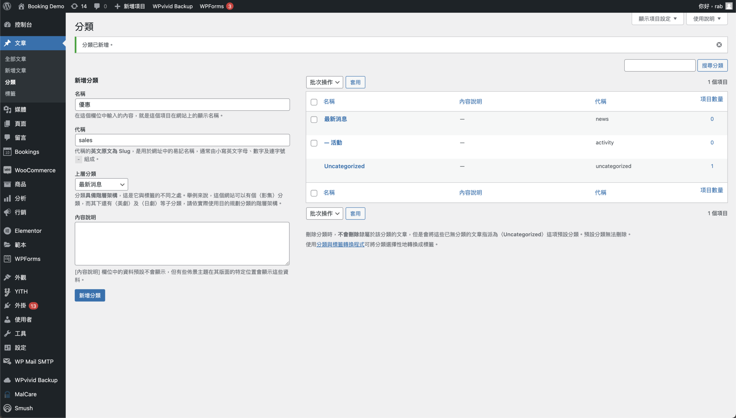 分類可以依照需求整理上層分類,分類名稱可以打中文,但代稱(slug)的部分建議使用英文。