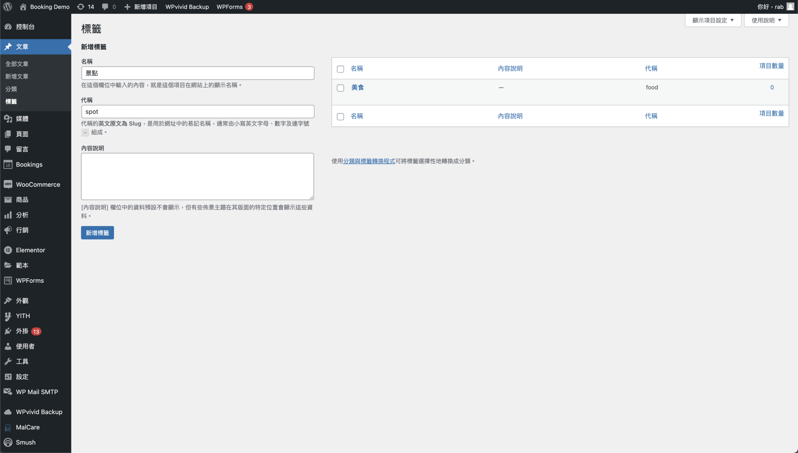 標籤名稱可以打中文,代稱(slug)的部分建議使用英文。有時候誤新增標籤可以在此進行刪除或修改。