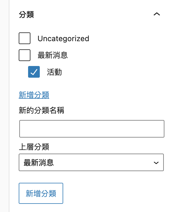 文章的分類設定,可以在此勾選,也可以在此自行新增分類。