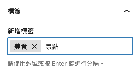 文章的標籤,可以自行新增已存在標籤,或是直接新增新標籤,須以逗號或Enter進行分隔。