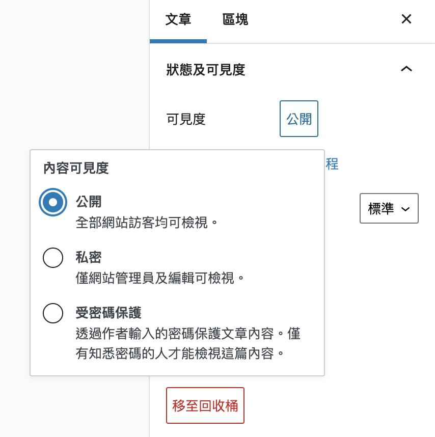 內容可見度除了草稿、公開,還可以設定為私密文章、受密碼保護文章。