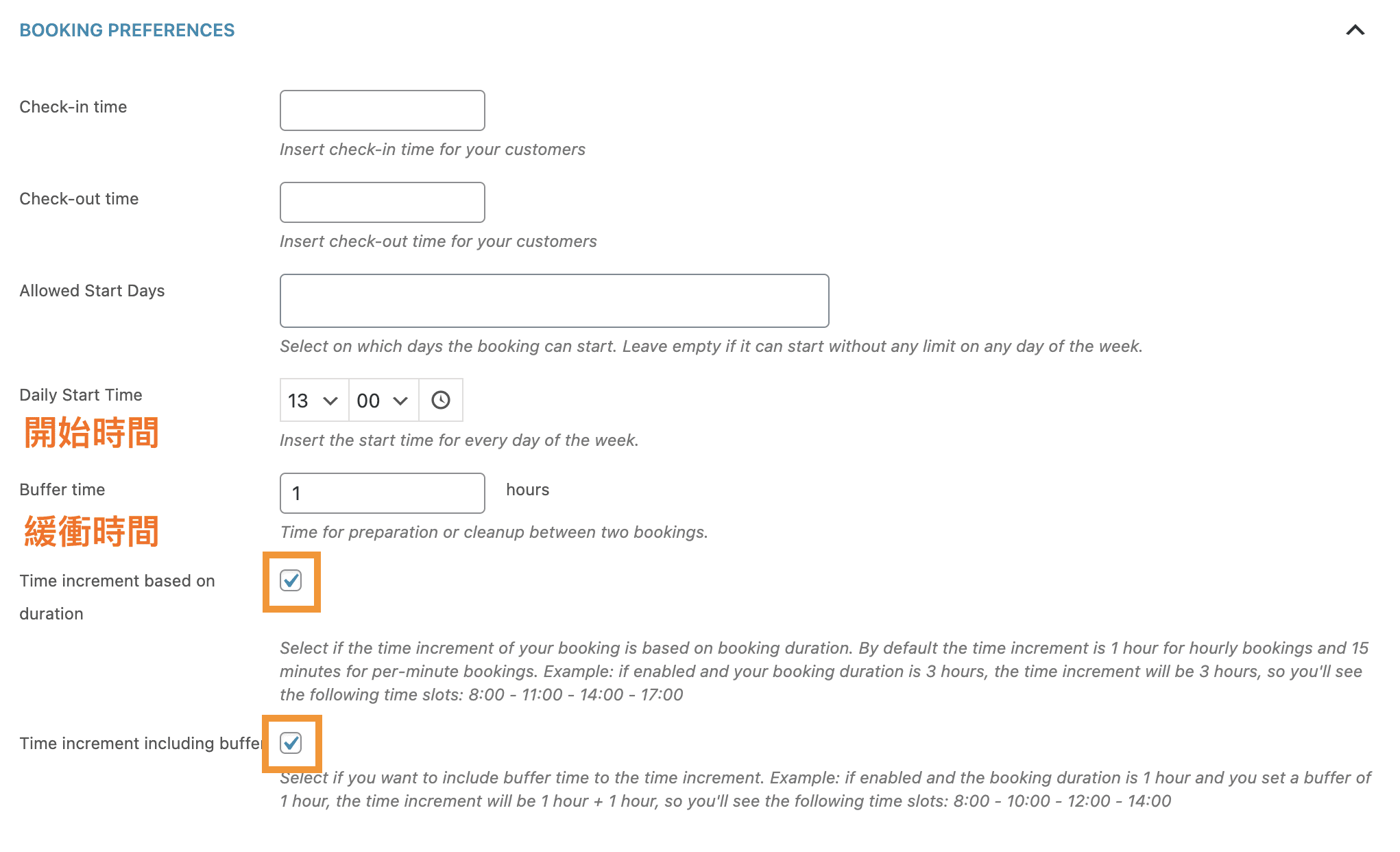- Default start time in booking form 預約默認開始時間:這邊我們設定第一個可以預約的時間。