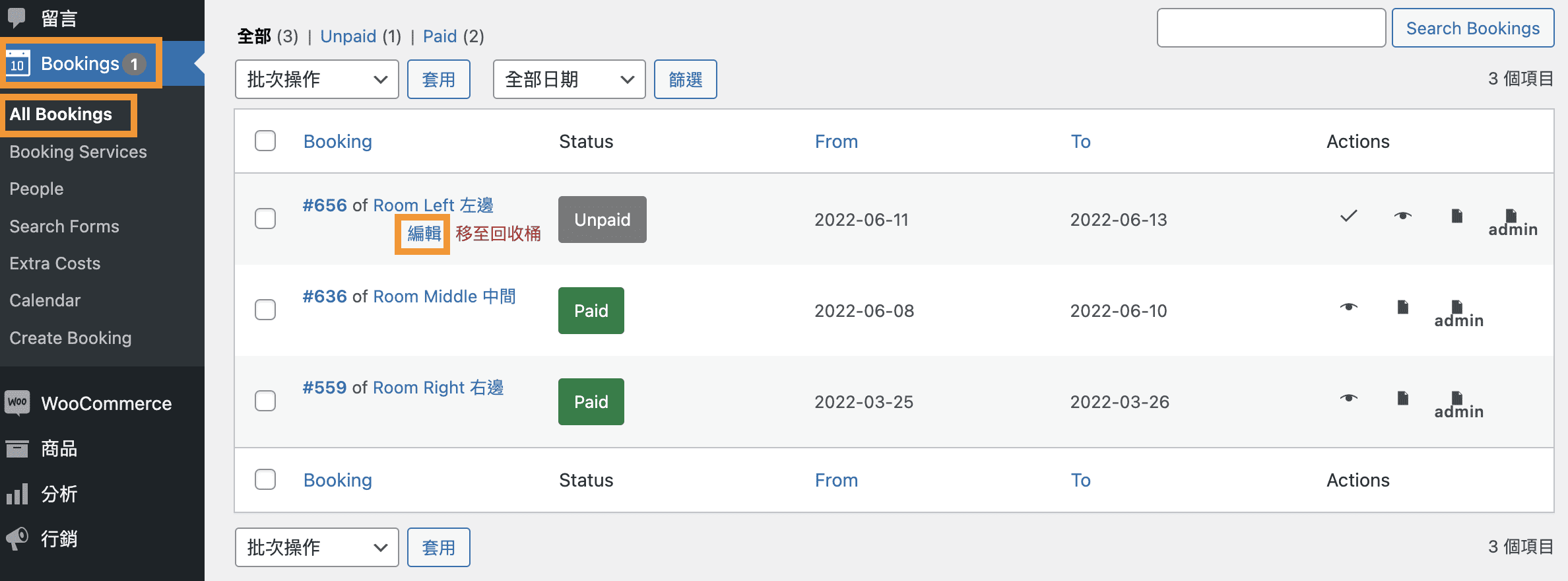 後台 -> Bookings -> All Bookings 查看所有訂單。