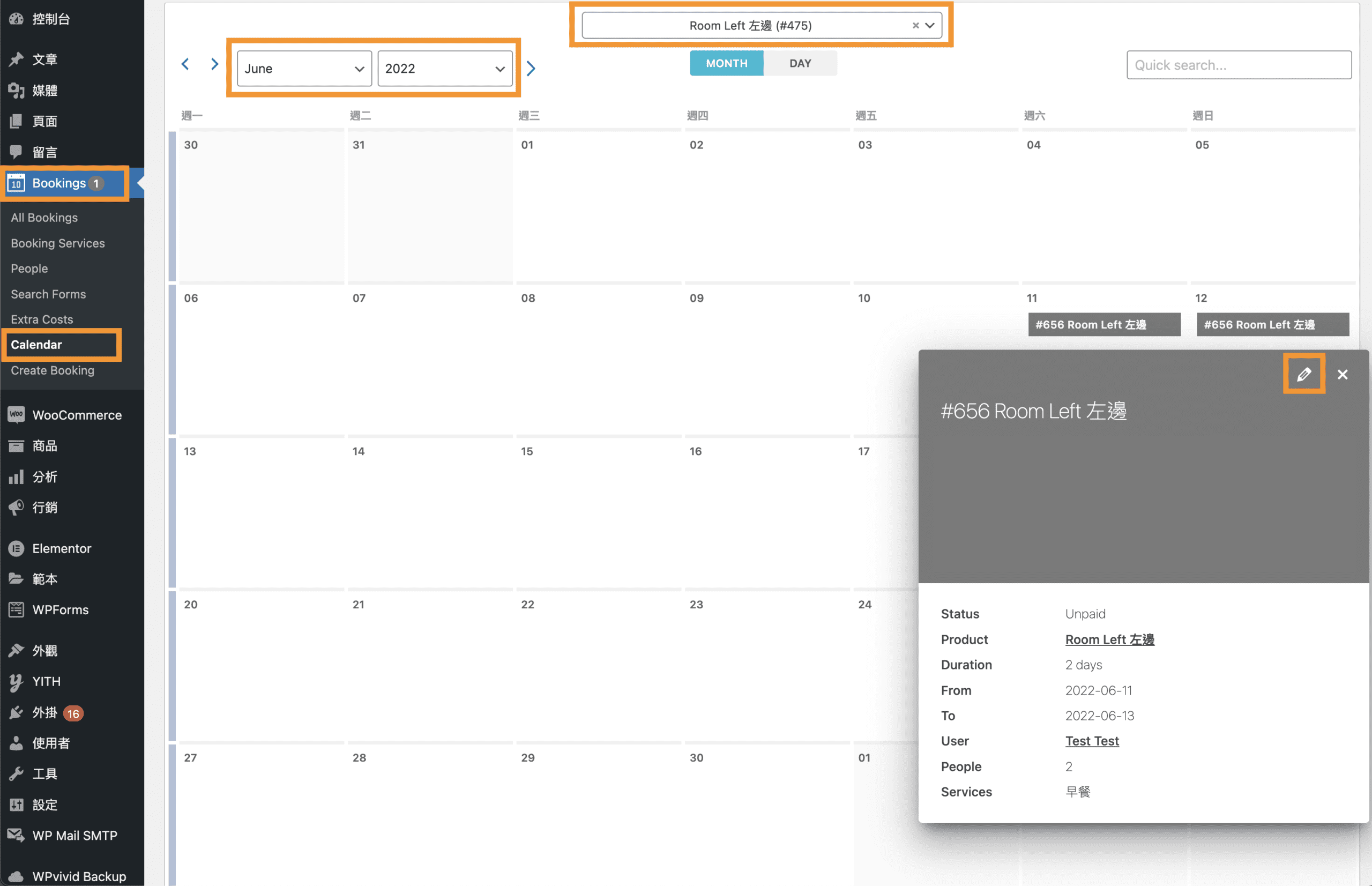 後台 -> Bookings -> Calendar 查看月曆式的訂單,可以清楚看到哪天有什麼預約,點選訂單會出現訂單內容框。