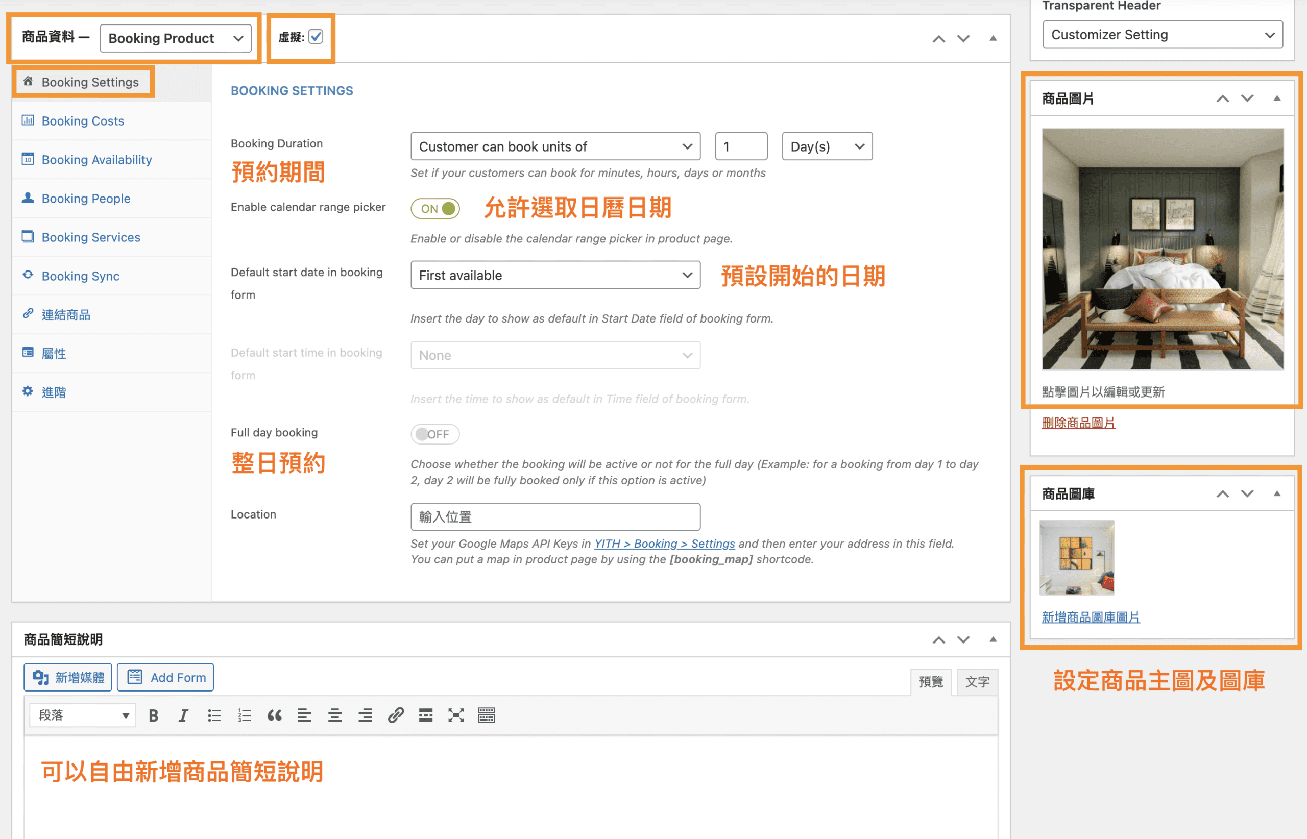 商品資料需選擇 Booking Product,虛擬的地方需打勾,預約的部分屬於虛擬商品。