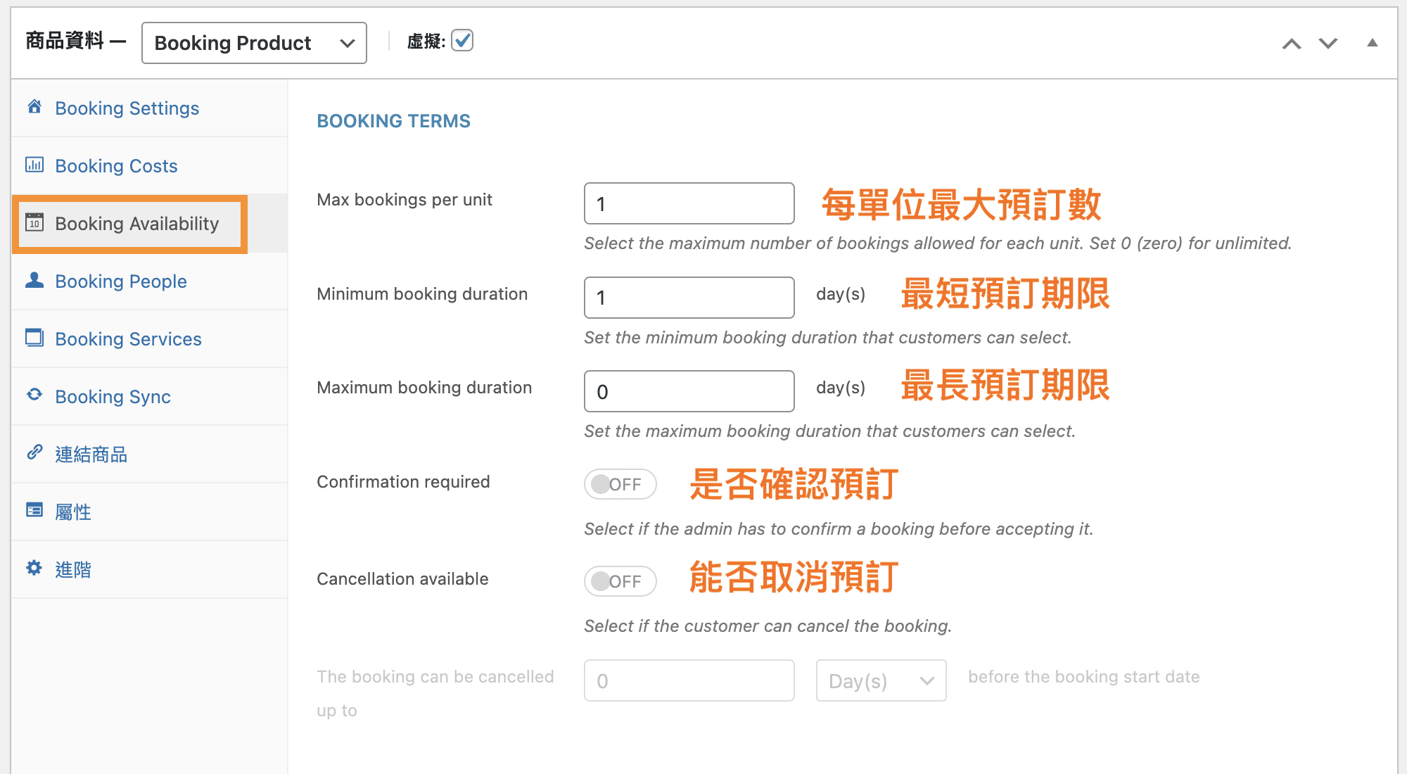 商品資料同樣需選擇 Booking Product,虛擬的地方需打勾,預約的部分屬於虛擬商品。