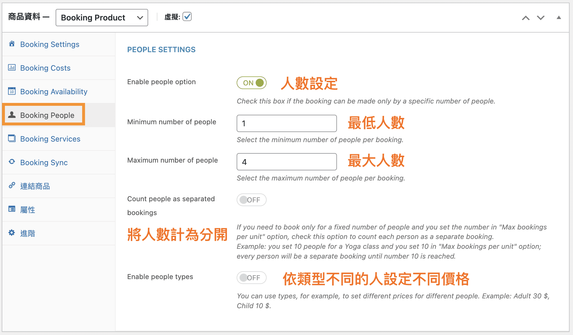 新增好之後再回到預約商品編輯後台進行修改,Booking People -> Enable people types 打開,下面就可以看到設定的地方。
