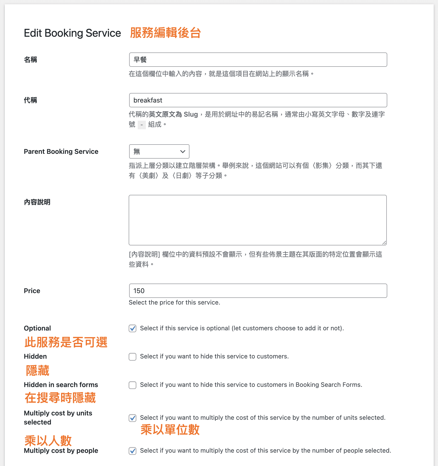 - Multiply cost by units selected:如果您想將此服務的成本乘以所選單位的數量,請選擇此項。例如,顧客訂房三天兩夜,選擇加購早餐,會自動乘以天數,加購兩天的早餐。