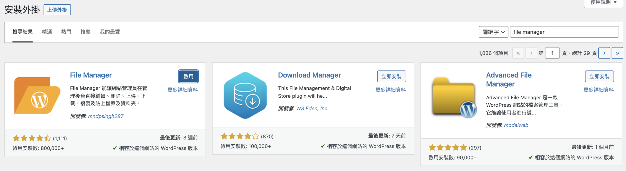 在安裝外掛處搜尋「File Manager」後,安裝、啟用。