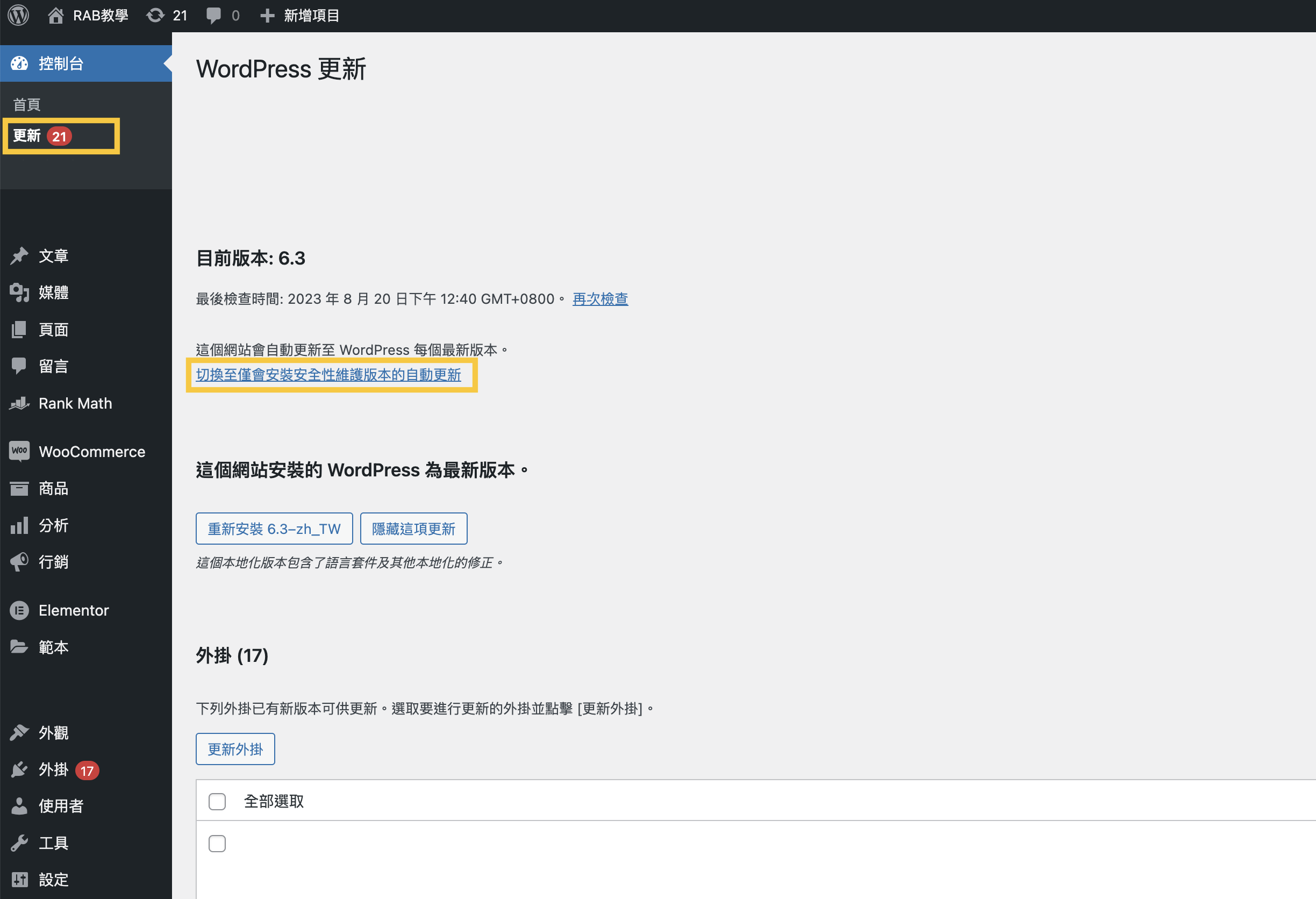 我們會建議將WordPress核心更新設定為「切換至僅會安裝安全性維護版本的自動更新」,這部分會防止WordPress推出新的核心版本時,網站就自動幫您更新,這個舉動非常可能造成網站跑版或網站掛掉,因為網站外掛們可能還沒和最新的核心版本兼容,所以除非是資安維護的核心版本,我們不建議您任意更新到最新的WordPress核心版本。